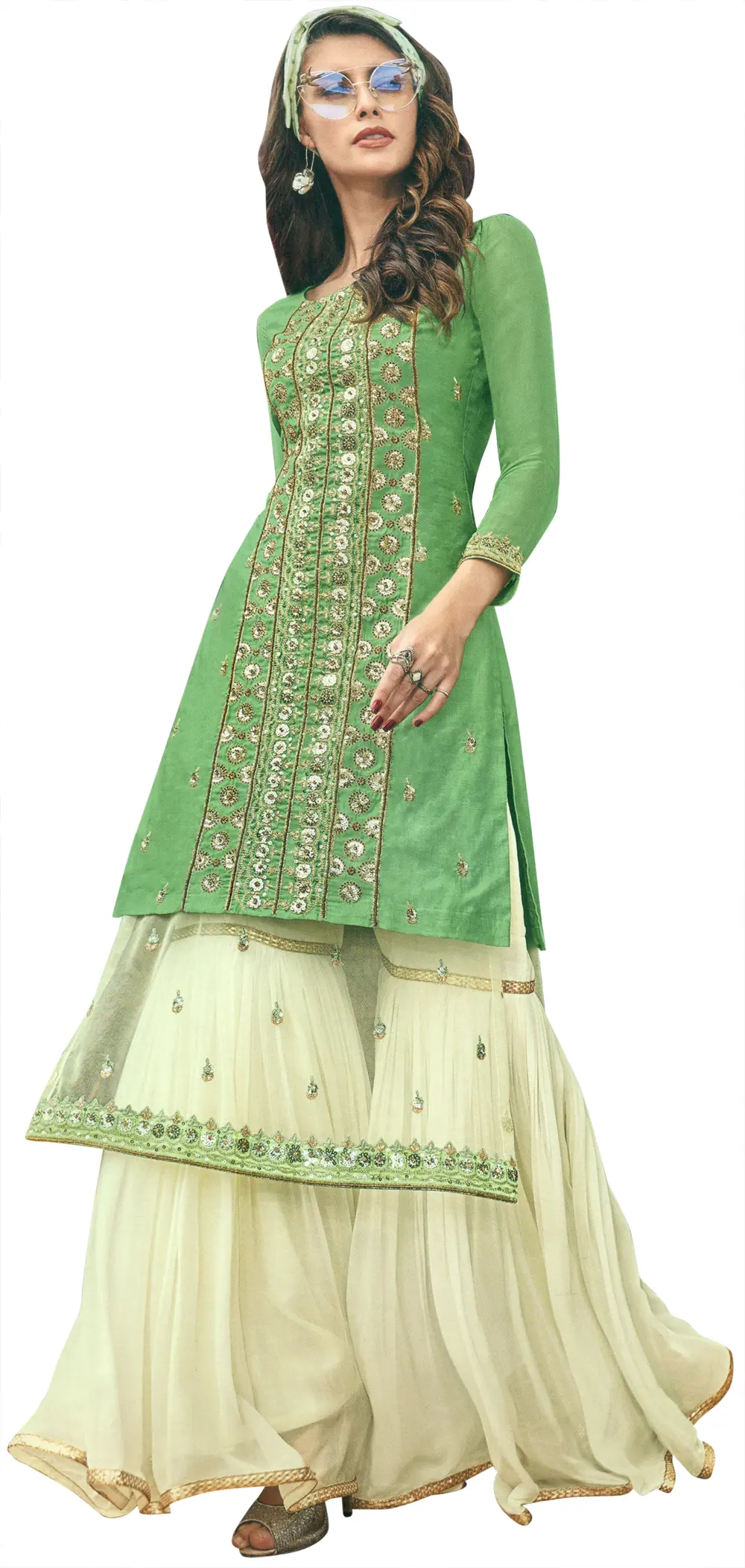 Zephyr-Green Flared Palazzo (Sharara) Salwar Kameez Suit with Heavy Zari and Beaded Embroidery