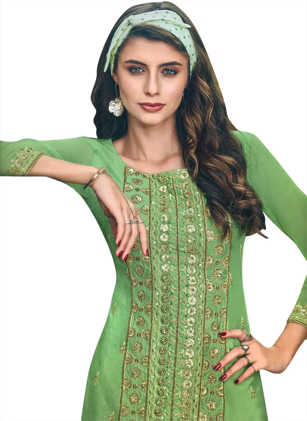This palazzo suit is a testament to versatile fashion. The combination of the stylish kameez and the flowing palazzo pants creates a harmonious silhouette that is both comfortable and chic. The Zephyr-Green color is universally flattering and can be effortlessly styled to suit various personal preferences. The accompanying dupatta, crafted from a coordinating net fabric, is generously sized and drapes beautifully, completing the ensemble. You can style it in numerous ways to add your personal touch. This outfit is not just clothing; it's an experience, designed to make you feel confident, radiant, and utterly unforgettable. Whether you're attending a wedding, a festival, or a special dinner, this Zephyr-Green Palazzo Salwar Kameez suit promises to be a showstopper.
