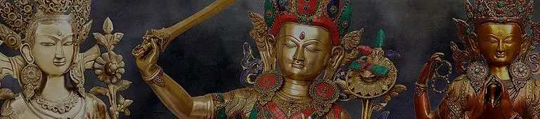 Maitreya is identified by the stupa adorning his headdress and the flask held in his hand. Manjushri bears a sword with which he pierces the veil of ignorance and a book that symbolises knowledge.