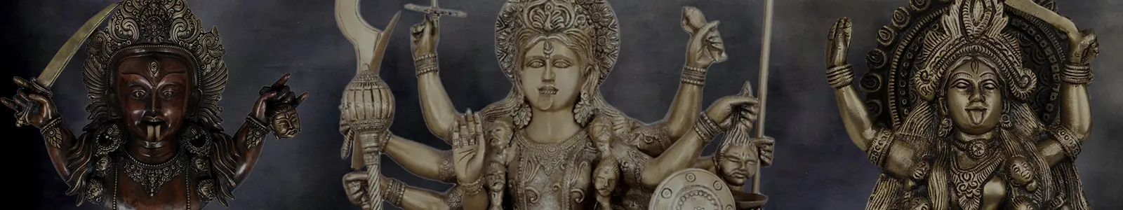 In the Exotic India collection of this Oriental devi sculpted in exquisite brass, She is seen vanquishing adharmees, weilding a number of earthly and heavenly weapons in superlative fierceness, and stepping over Lord Shiv in all her glorious nakedness. Exotic India's brass statues of Goddess Kali comes in a colourful variety of monotone finish and varying degrees of lustre.