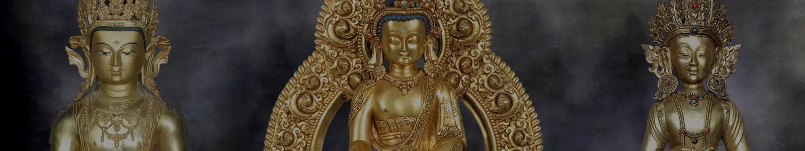 Sculptures that lend themselves to polychromy (the Nepalese have a thing for bright colours) are painted in vibrant yet liturgically prescribed colours. In cases of gilding, the skin is painted cold gold (molten gold mixed with gelatin or mercury), with the eyes and the mouth painted on. Some of our pieces are strategically inlaid with intense colours.