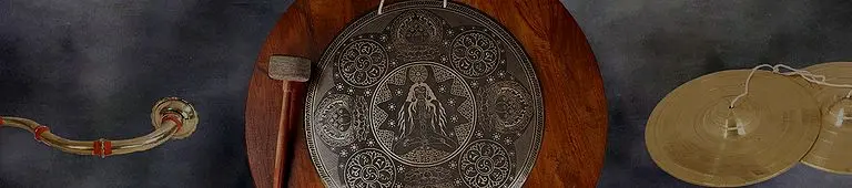 Mokyugo, an instrument in the shape of two fishes facing each other, is made of wood. Keisu, a bell in the shape of a bowl, is made of bronze. A Shukei is a hand-held bowl that is made from brass or any other metal. Taiko drums are also found in the main hall. These are wooden-based and are played at both ends using wooden sticks.