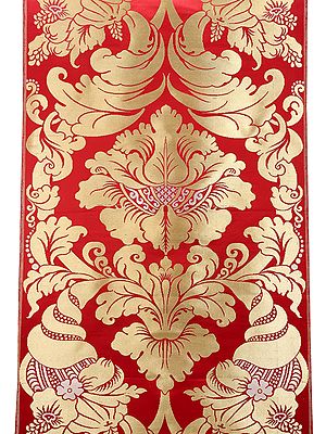 Racing-Red Handloom Brocade Silk Fabric from Banaras with Auspicious Tibetan Motifs